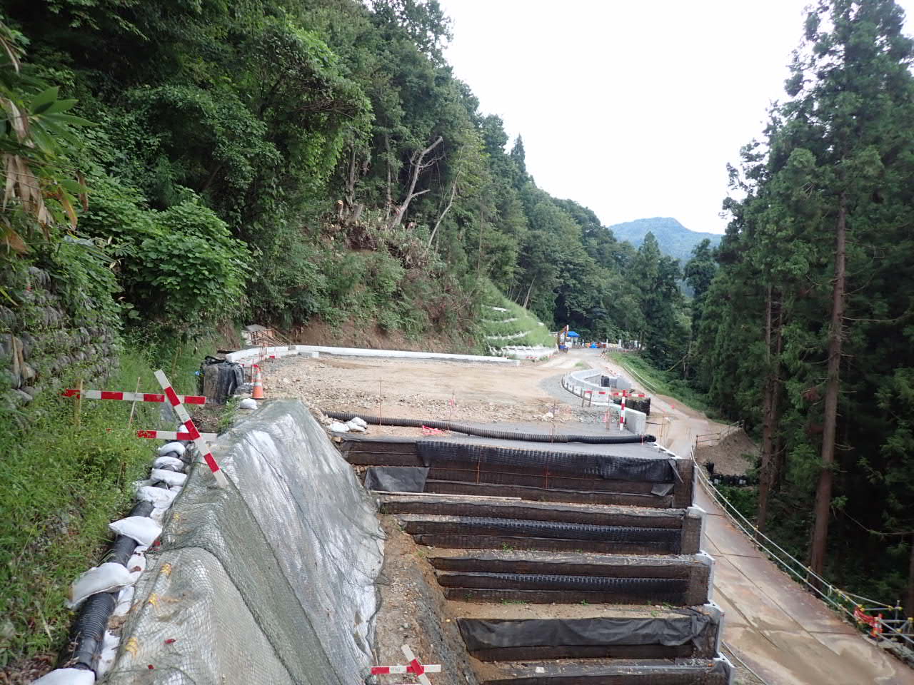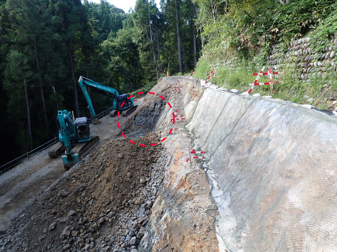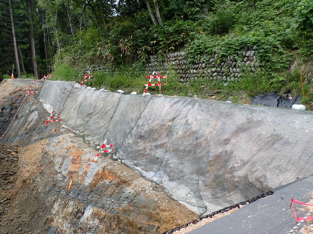 拡幅する道路のために地盤を掘って削っていますが、土質によっては水を含むと崩れやすくなるために、山の上の方から地表を伝ってくる雨水が浸透しないように、ビニールをかぶせて、また、そのビニールが飛散しないようにネットも被せているんです('◇')ゞ