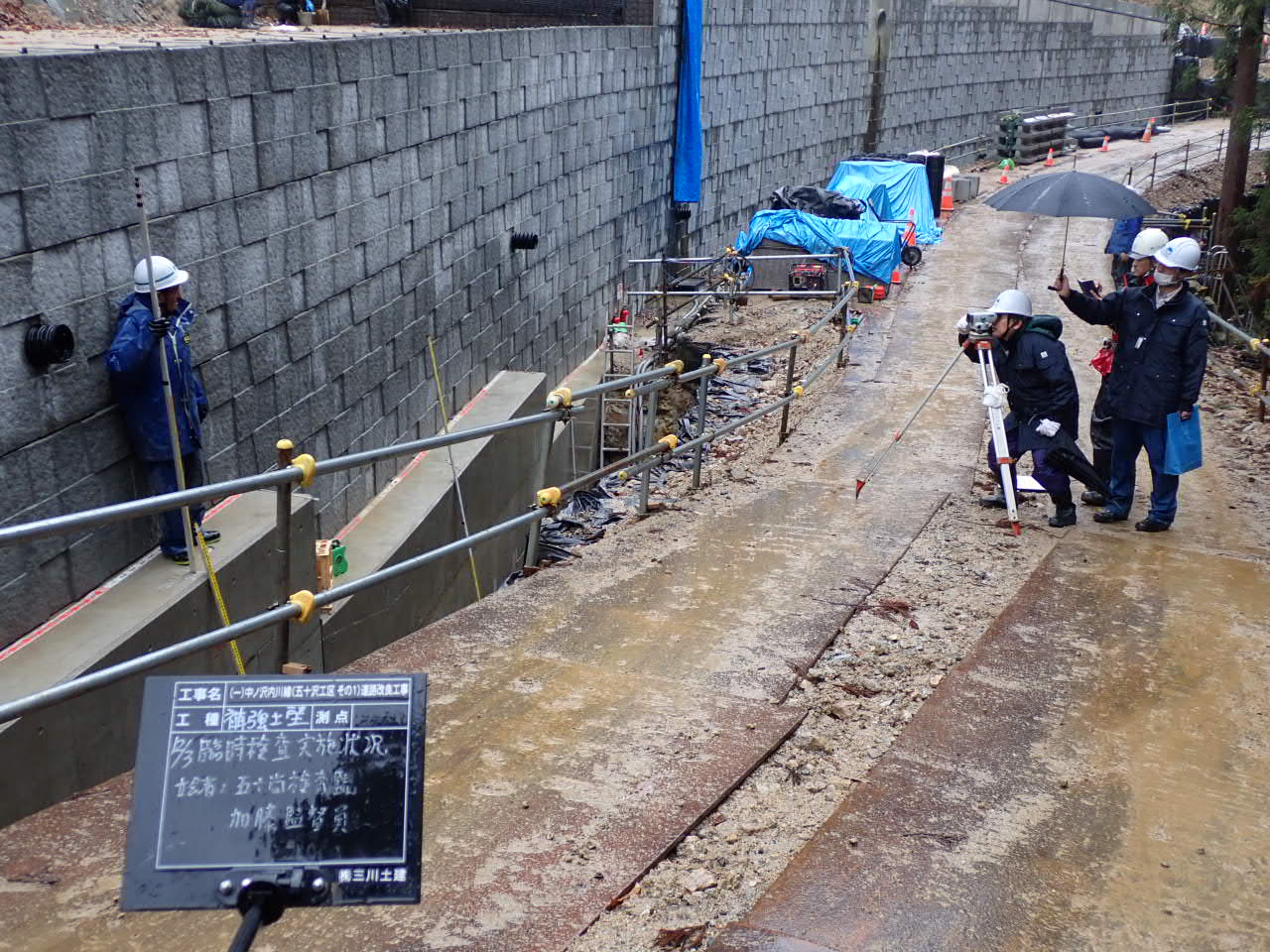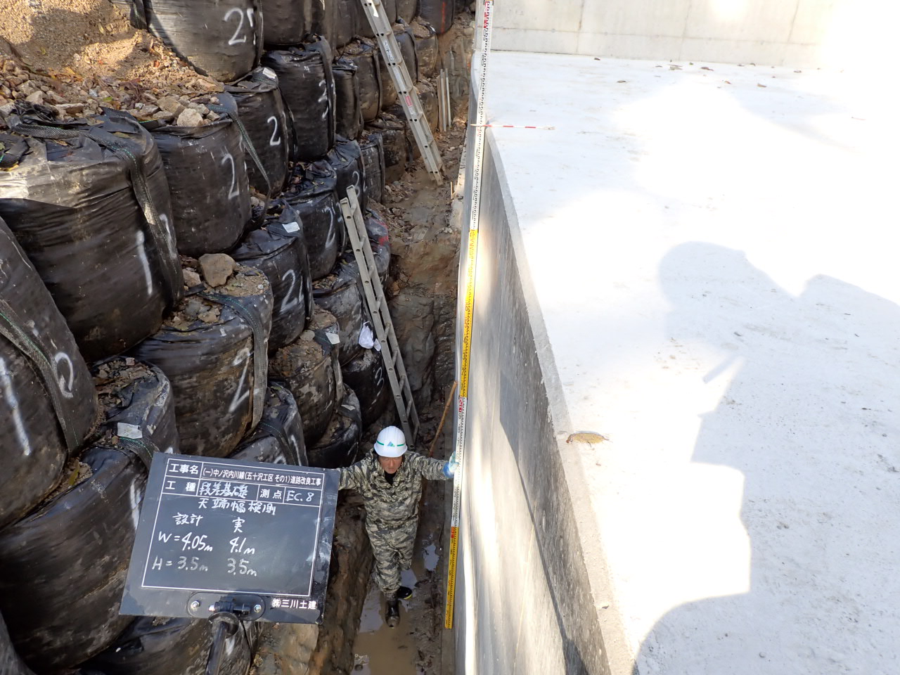 下の写真は、その補強土壁の下に見える【コンクリートの基礎】について埋め戻す前に発注者の方から臨時検査を行っていただいている写真です。