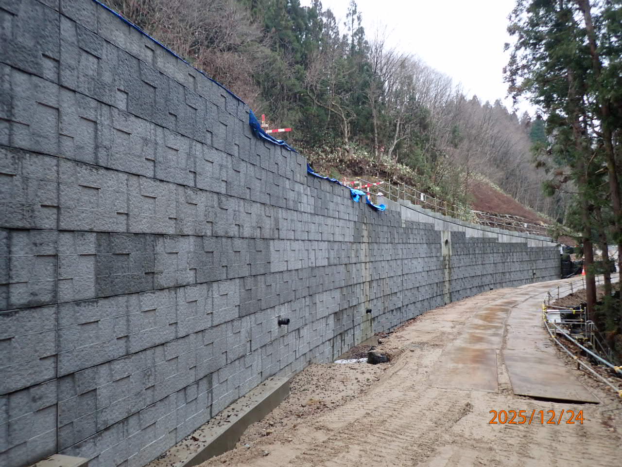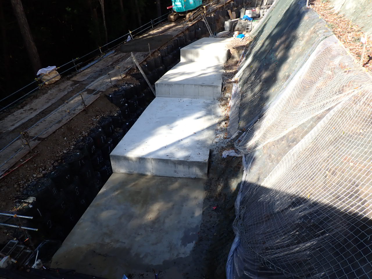 下の写真の壁が補強土壁で壁の裏側の土の圧をしっかりと受け止めれる構造になっています。