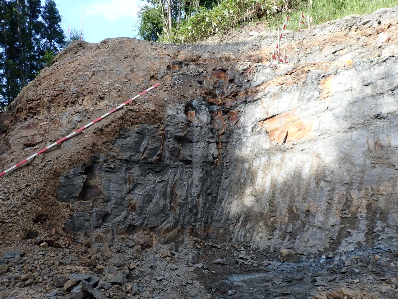 写真でいう奥の方の土質の中に、赤い丸の所のひときわ濃い色の部分。。。