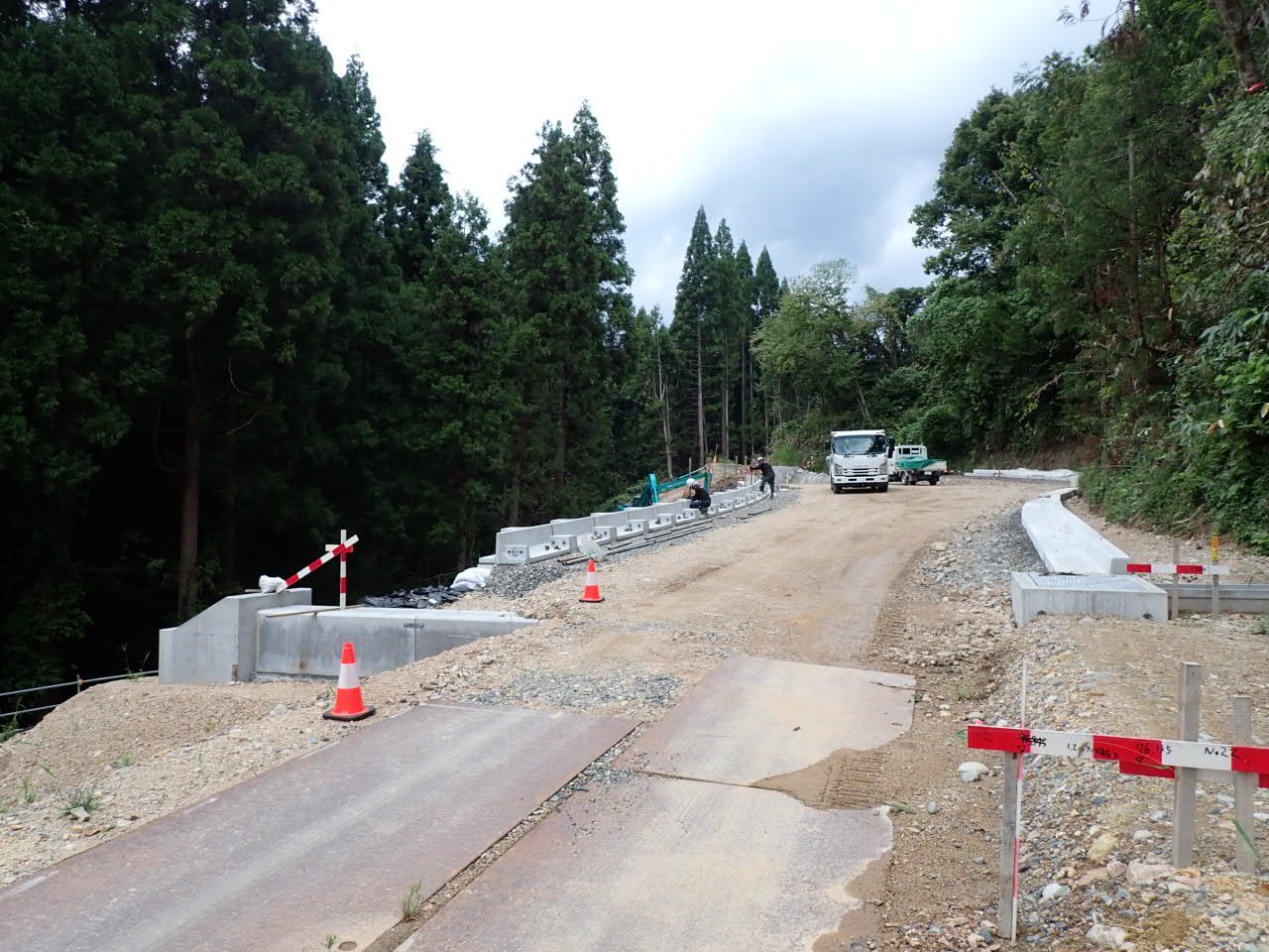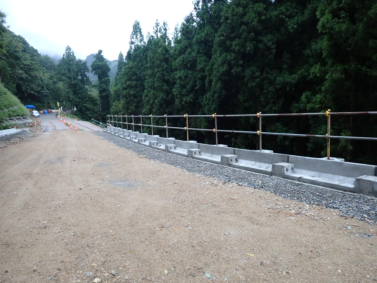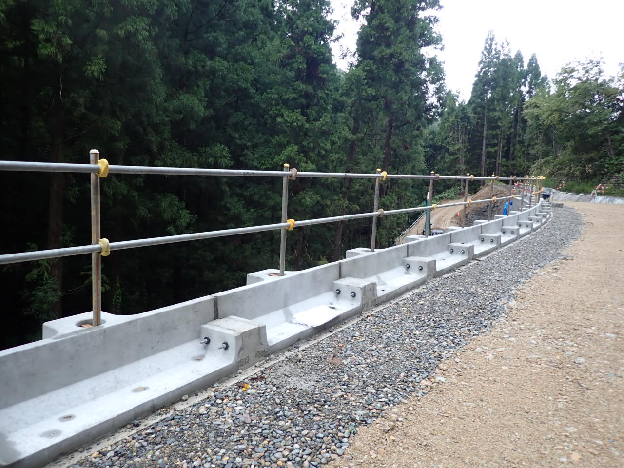 工事は無事故・無災害で終われるように最大限安全対策を施して進めているため、例えば下の写真のように広がった道路の谷側は転落や墜落の可能性がでてきます。