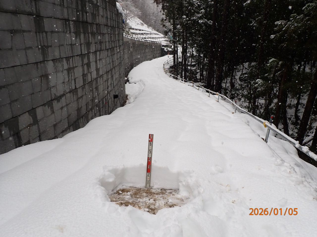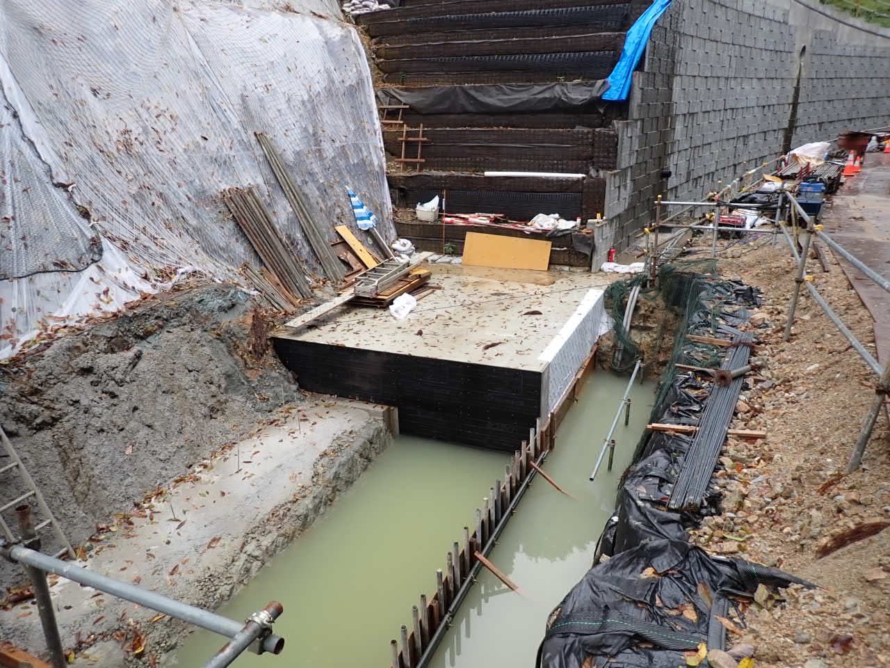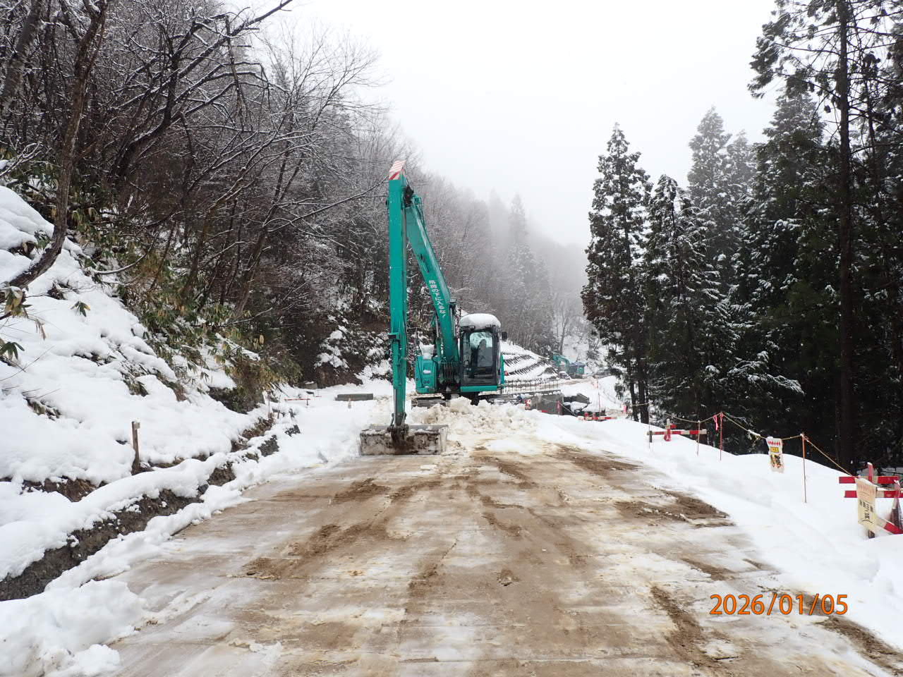 工事は無事故・無災害で終われるように最大限安全対策を施して進めているため、例えば下の写真のように広がった道路の谷側は転落や墜落の可能性がでてきます。