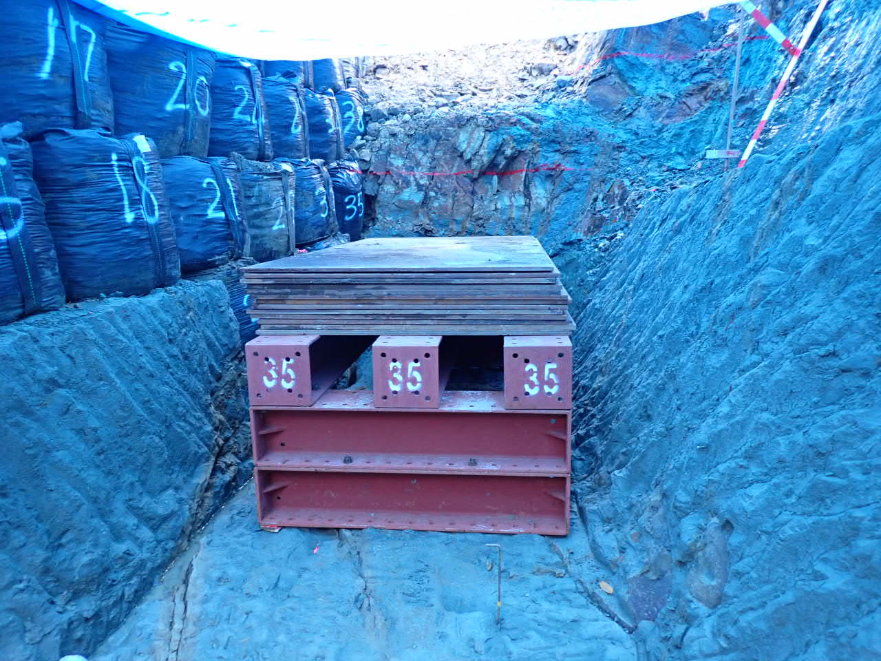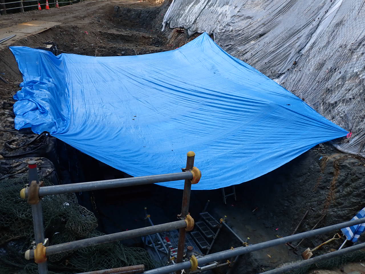 このブルーシートの中で行われているのは「平板載荷試験」です。天気予報で雨の降る恐れがあったので雨に備えてのブルーシート養生です('◇')ゞ
